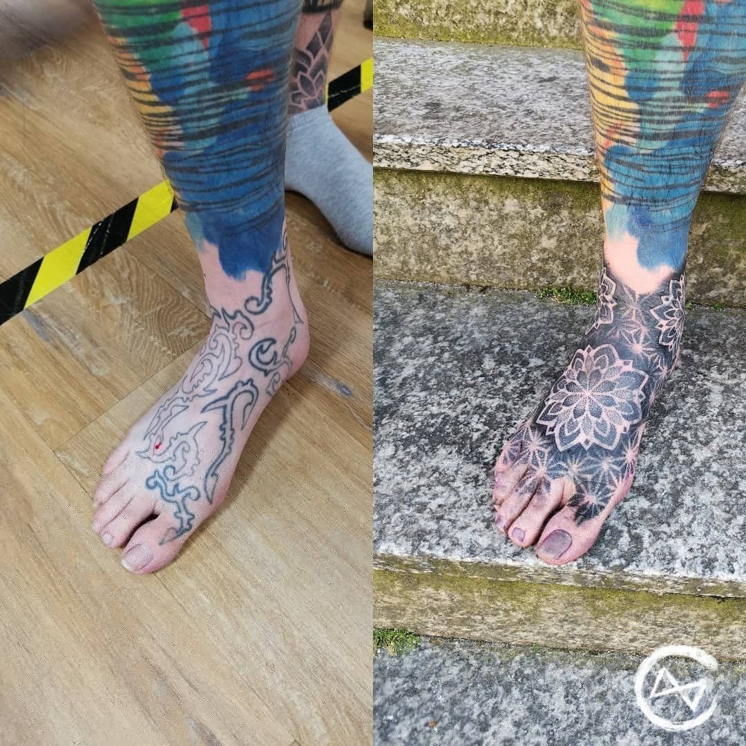 Blast over, Touch up , Blast-over Tattoo, Mandala Tattoo, Mandala Cover-up, Tattooed Feet, Tattooed Foot, Mandala Tattoo, Dotwork and Linework Tattoo, Mandalatattoo, Flensburg Tattoo Studio, Schwarze Zeit, SchwarzeZeitTattoo