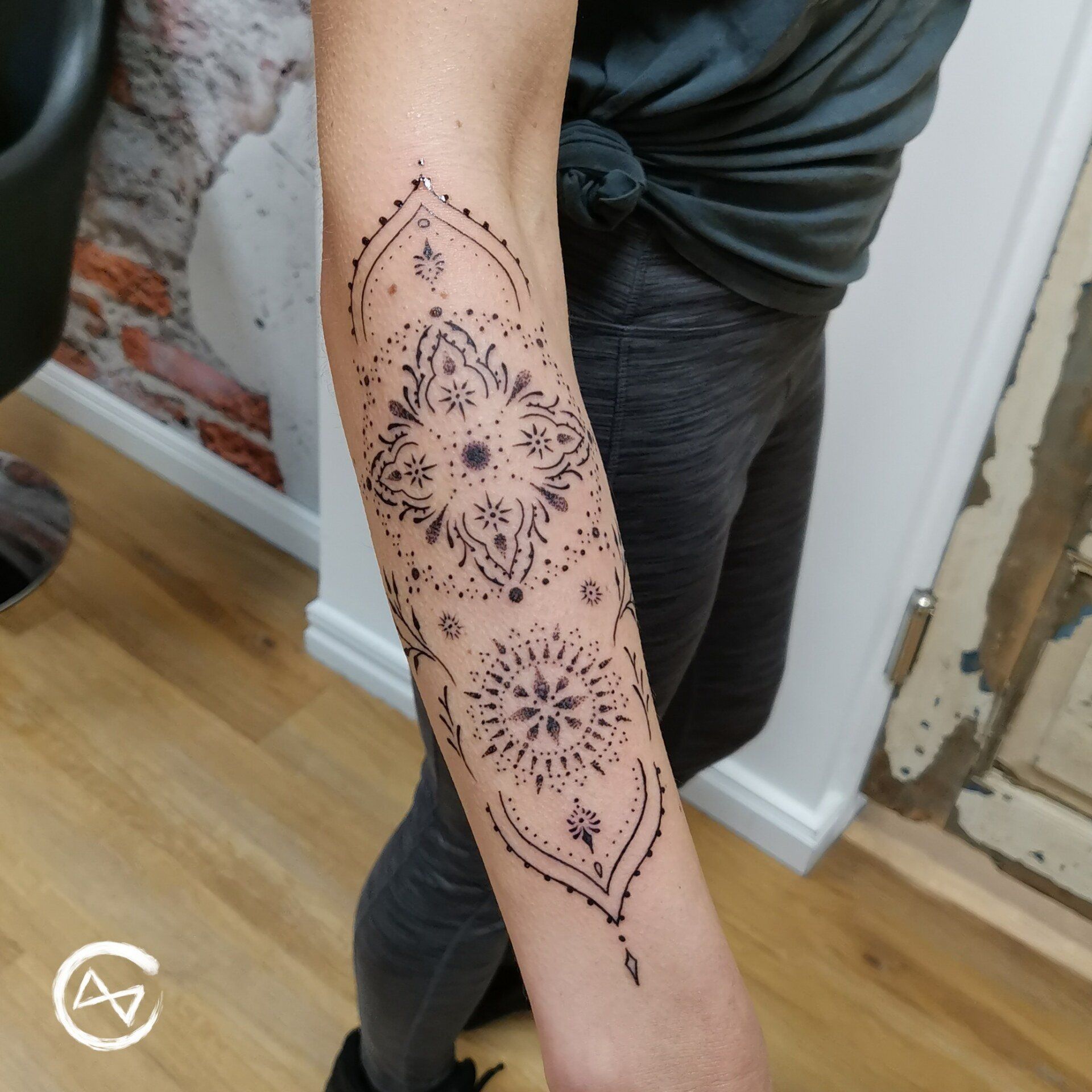 Ornamente, Mandala, Tattoo, Armtattoo, Hand Tattoo, kleines Mandala, symetrisches Tattoo, Schleswig-Holstein, Flensburg, Tattoostudio, Schwarze Zeit