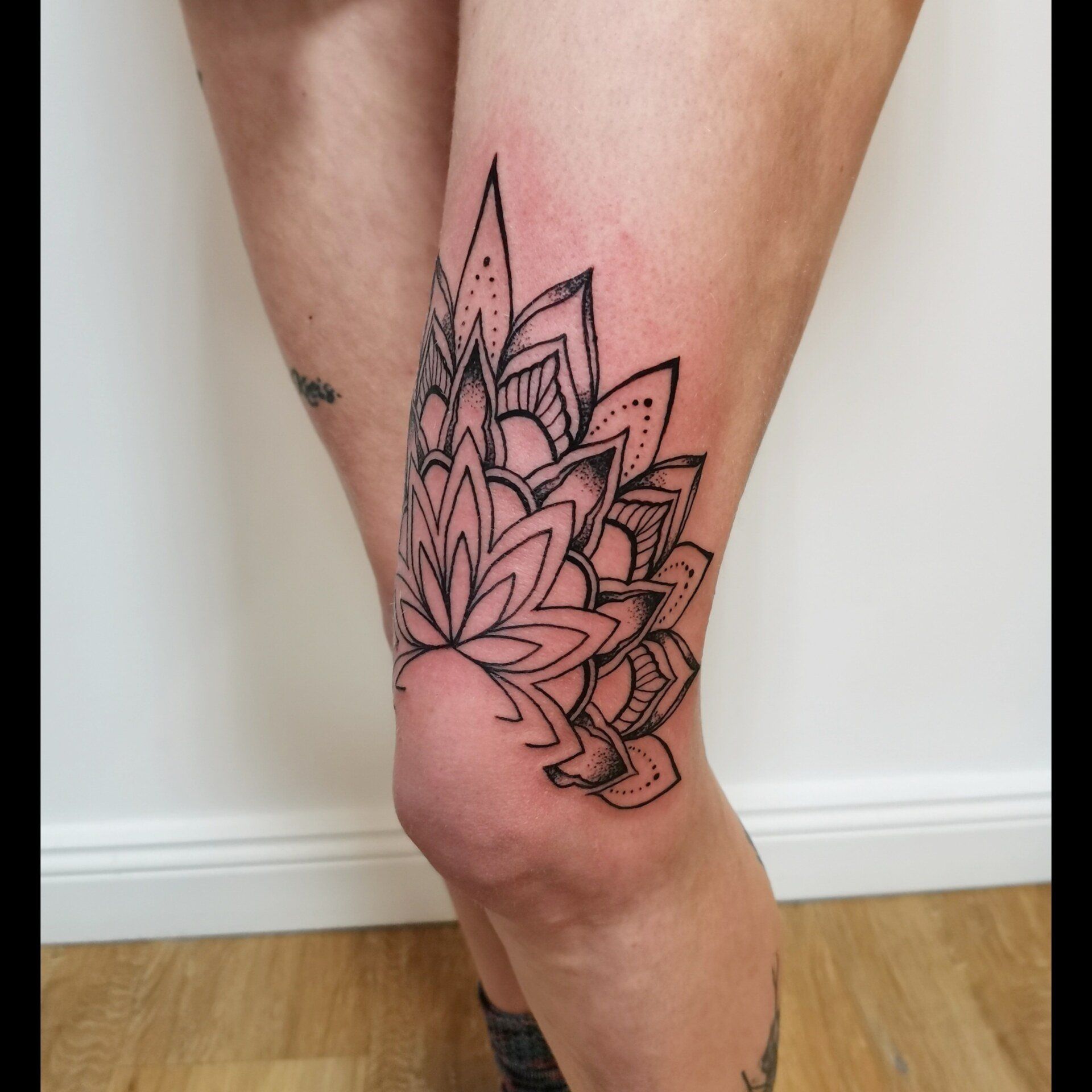Mandala Tattoo Knie, Knietattoo, Kneetattoo, Tattoed Knee Mandala, Mandala Tattoo, Dotwork and Linework Tattoo, Mandalatattoo, Flensburg Tattoo Studio, Schwarze Zeit, SchwarzeZeitTattoo