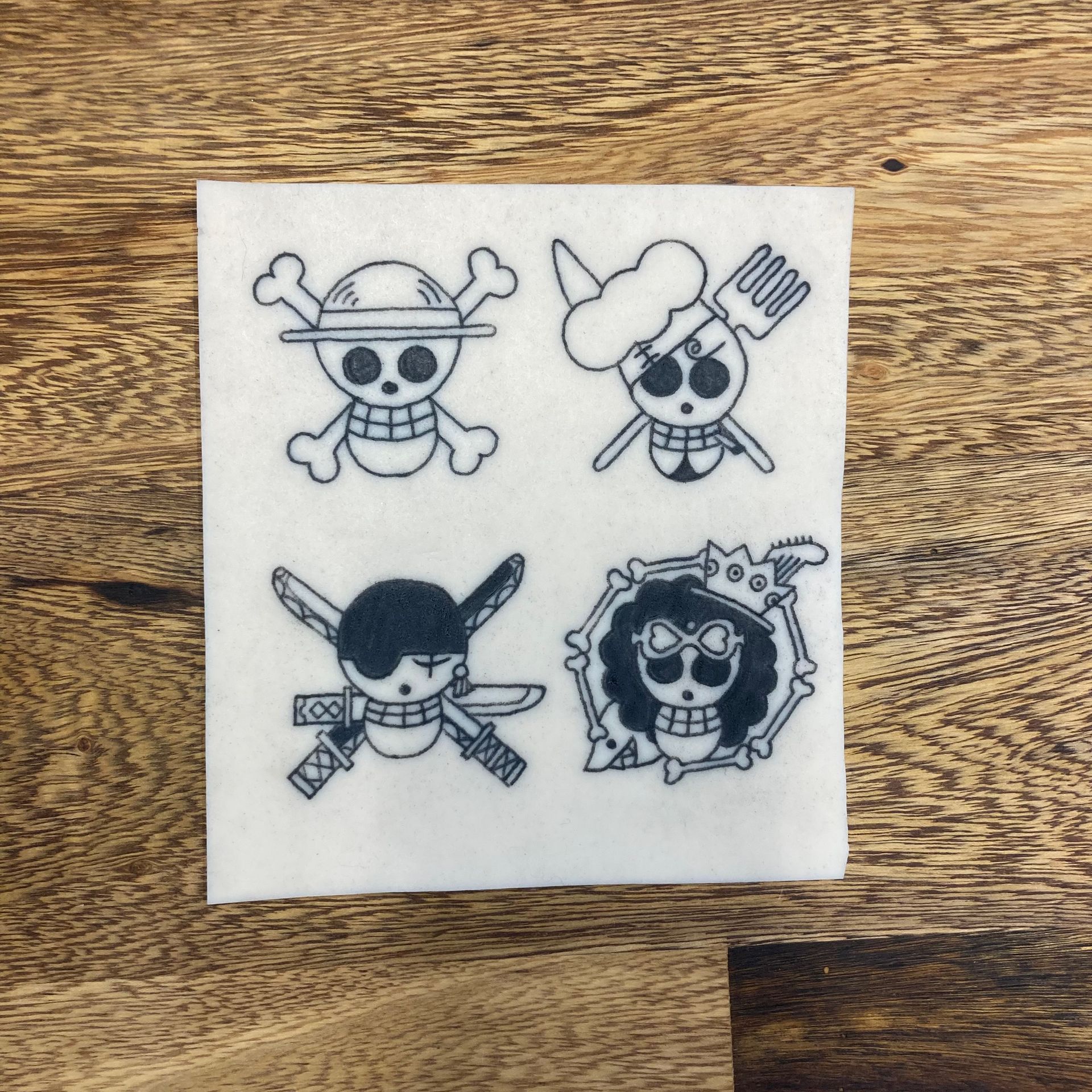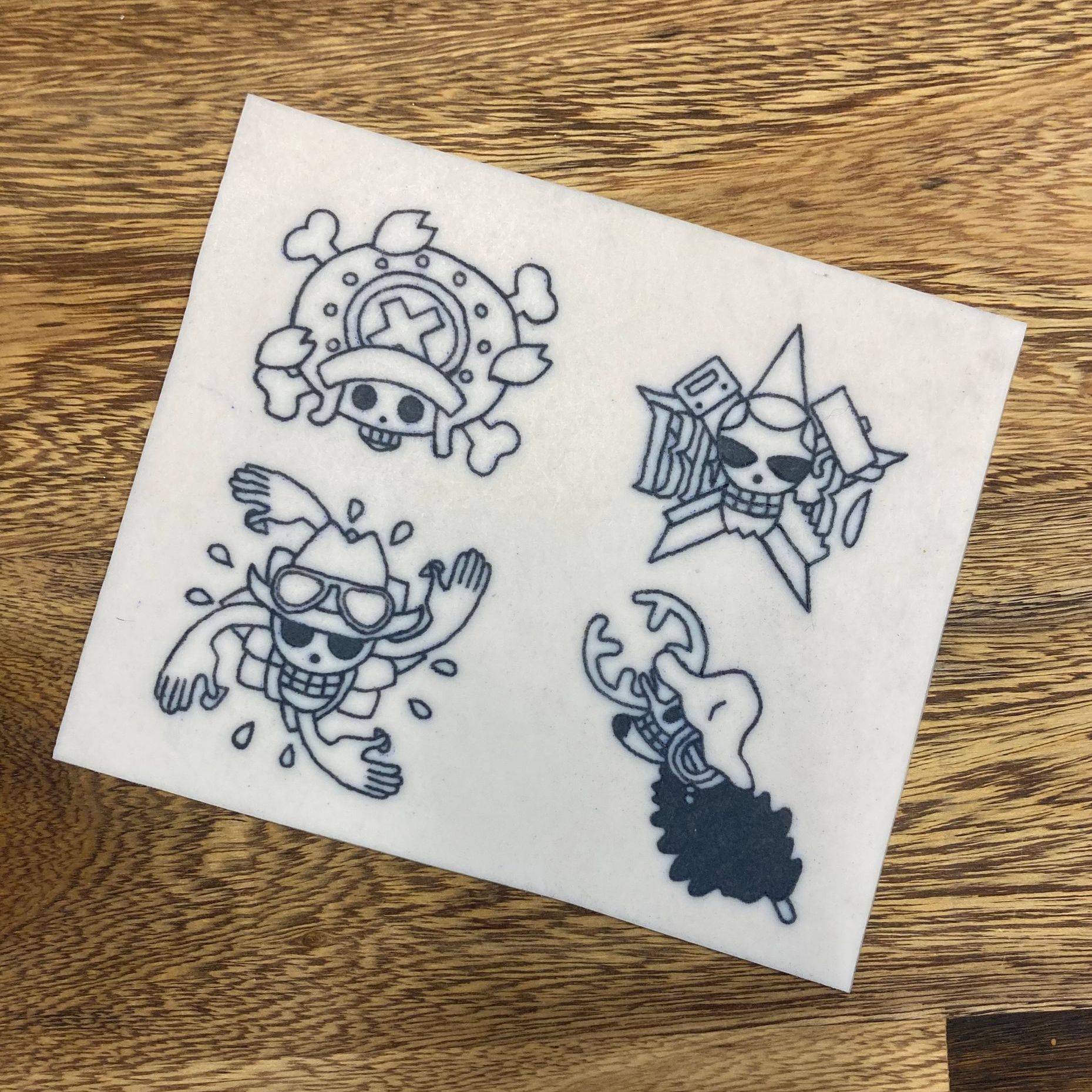 Übungshaut, Tattoo Übung, Tattoo, erste Schritte Tattoo, practise skin, tattoo practice, tattoo apprentice, Tattoo Lehrling, Schwarze Zeit, Flensburg, Tattoo Flensburg, Flensburg Tattoo Studio, One Piece Tattoo, One Piece Jolly Roger, Skulls , Anime , Manga, Chopper, Frankie, Lysop, Nico